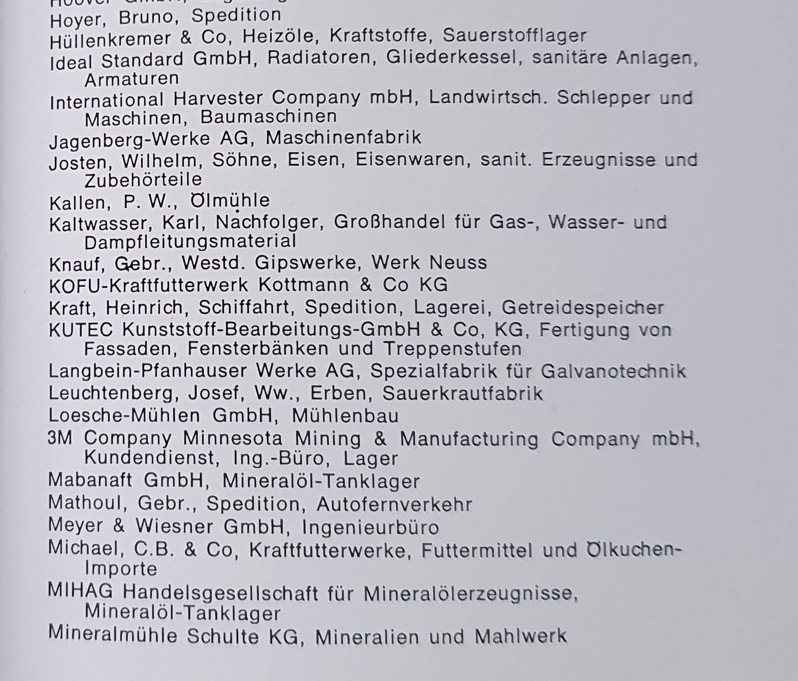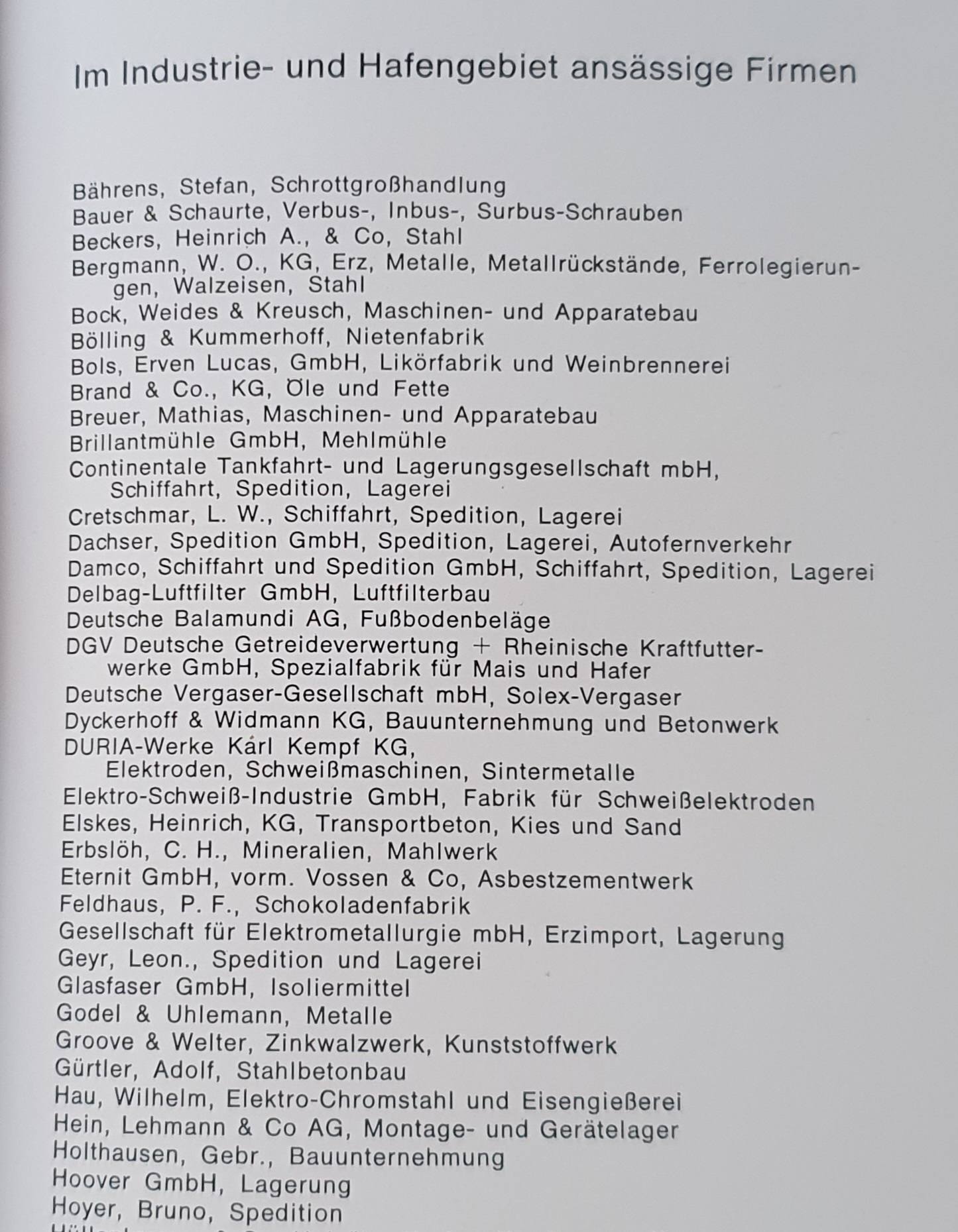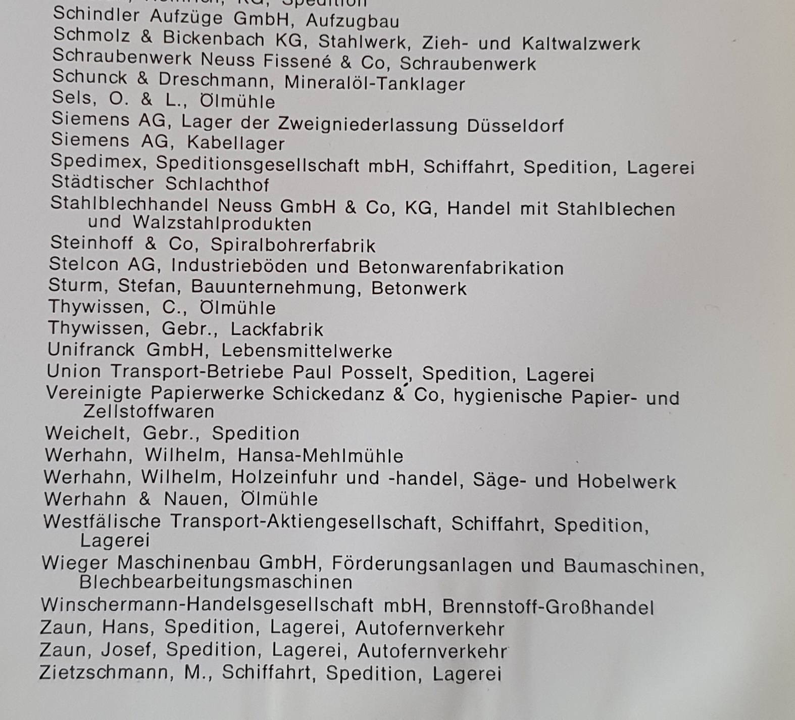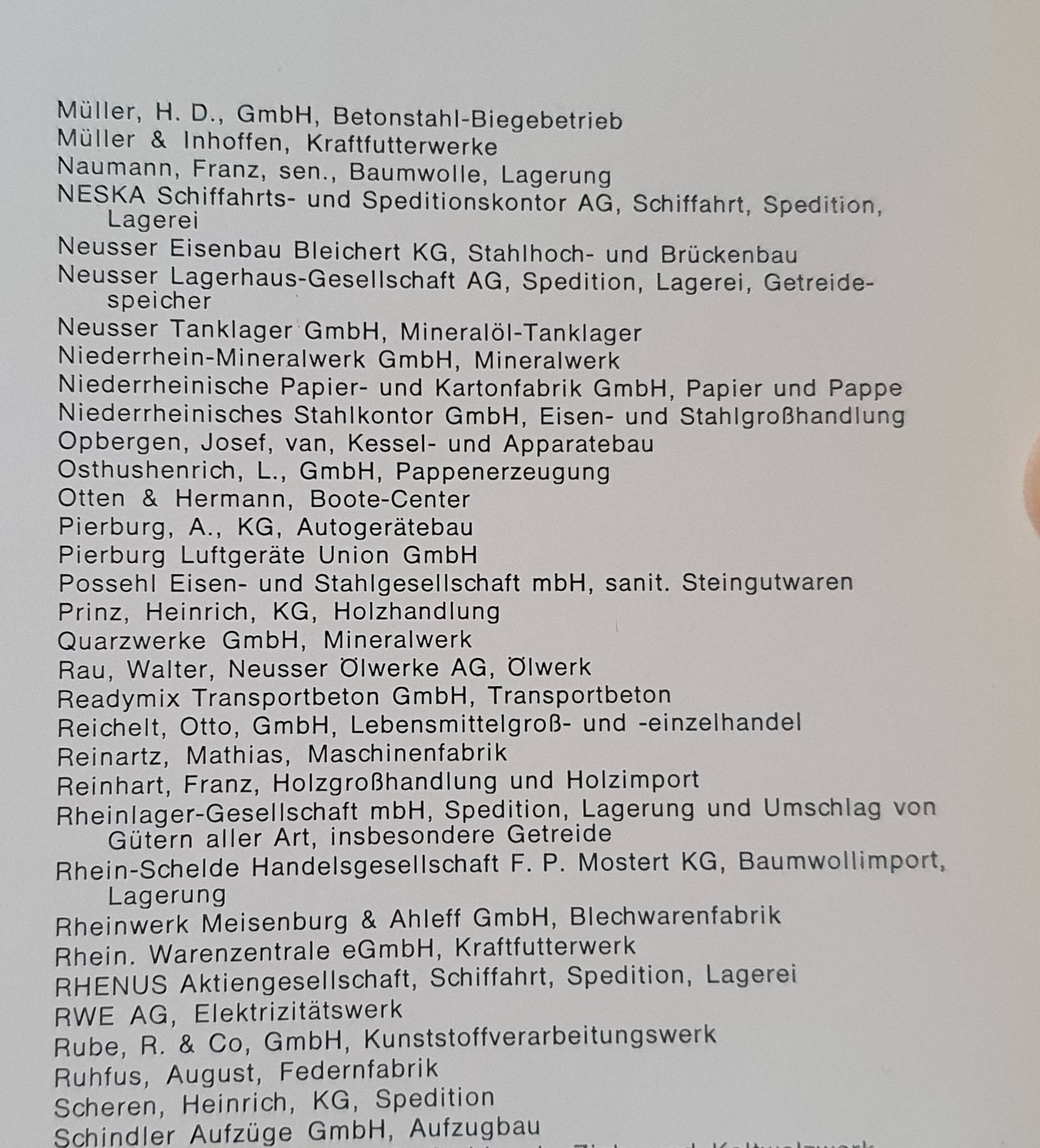 1970 gab es etwa 120 Firmen im Neusser Hafen, Johnny Müller aus der Facebookgruppe Neuss-History hat das mal kopiert und freundlicherweise eine Übersicht dieser Firmen erstellt. Vielen Dank dafür.