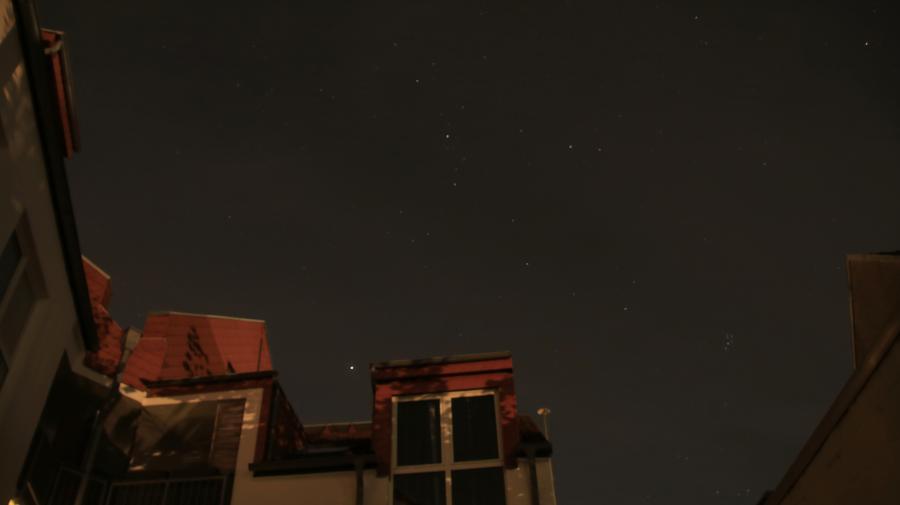 Die Erde dreht sich bekanntlich. Damit die Sterne als runde Lichtpunkte und nicht als Schlieren erscheinen, wählst du die Belichtungszeit passend zur Brennweite und Sensorgröße. Das klingt kompliziert, ist es aber nicht: Hast du eine EOS mit dem kleinerem APS-C-Sensor, rechnest du die Belichtungszeit mit der Formal „300 geteilt durch Brennweite“ aus. Hast du eine EOS 90D und das EF-S Objektiv 18-55mm darauf, das für die Aufnahme auf 18mm steht, ist die Rechnung 300:18=16,6. Das bedeutet, dass bei einer Belichtungszeit um die 16 Sekunden die Sterne rund bleiben und nicht zu Schlieren werden.