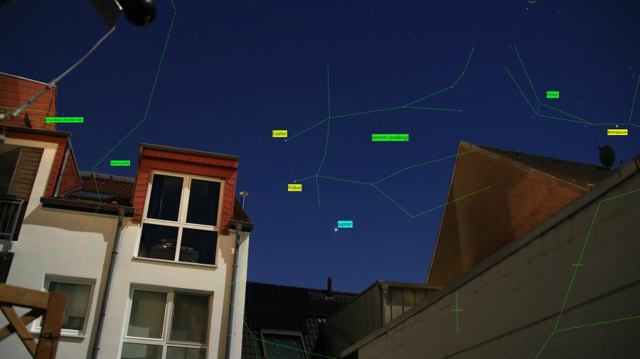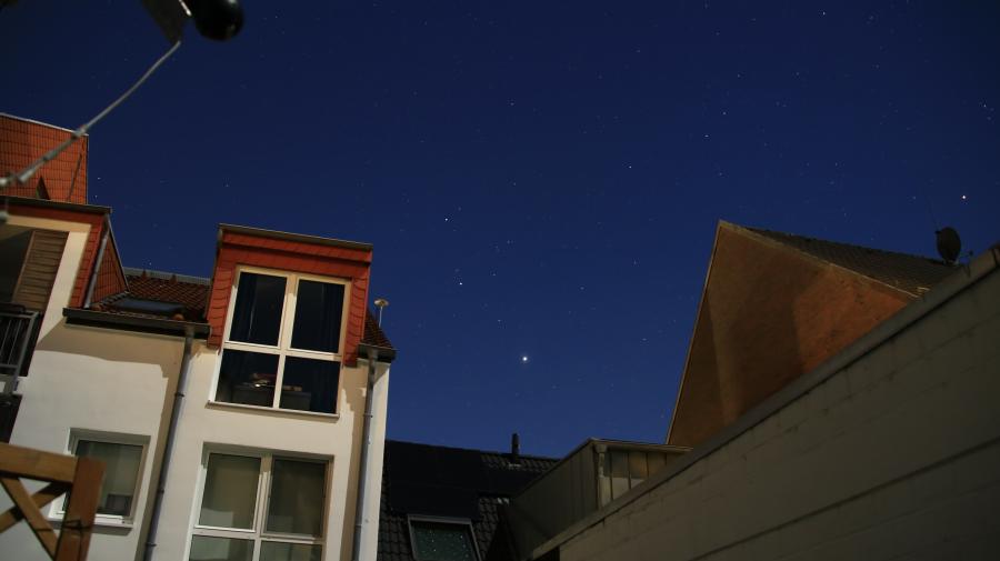 Da es in unseren Breiten immer Streulicht in der Atmosphäre gibt, kann man sich so ranprobieren, wie hell man das Bild haben will, also Sterne und Hintergrund