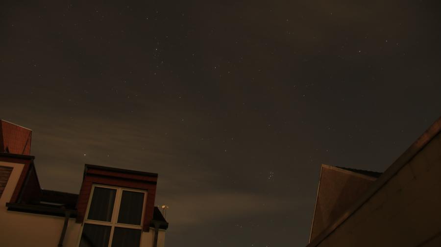 Die Erde dreht sich bekanntlich. Damit die Sterne als runde Lichtpunkte und nicht als Schlieren erscheinen, wählst du die Belichtungszeit passend zur Brennweite und Sensorgröße. Das klingt kompliziert, ist es aber nicht: Hast du eine EOS mit dem kleinerem APS-C-Sensor, rechnest du die Belichtungszeit mit der Formal „300 geteilt durch Brennweite“ aus. Hast du eine EOS 90D und das EF-S Objektiv 18-55mm darauf, das für die Aufnahme auf 18mm steht, ist die Rechnung 300:18=16,6. Das bedeutet, dass bei einer Belichtungszeit um die 16 Sekunden die Sterne rund bleiben und nicht zu Schlieren werden.